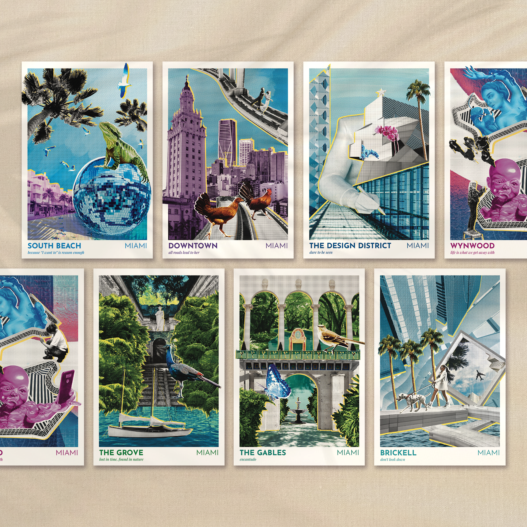 A postcard set inspired by different areas of Miami, made to complement “Who are you really?” exhibition by Lorena Knežević at Art Basel Miami.