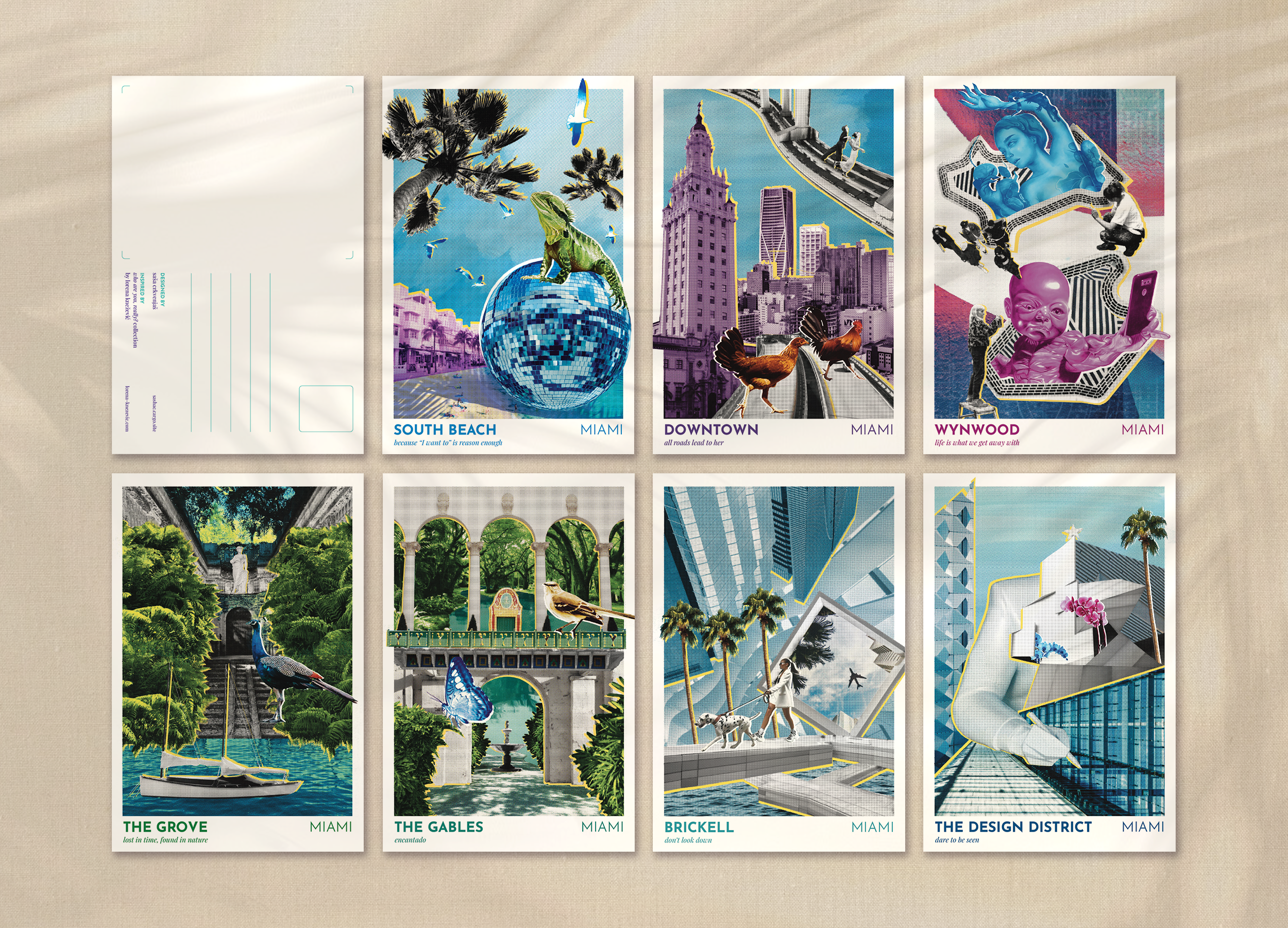 A postcard set inspired by different areas of Miami, made to complement “Who are you really?” exhibition by Lorena Knežević at Art Basel Miami.