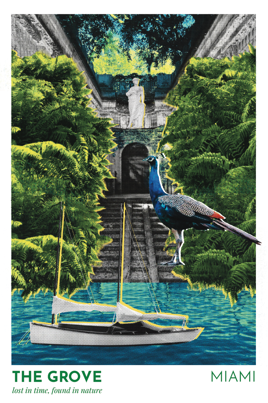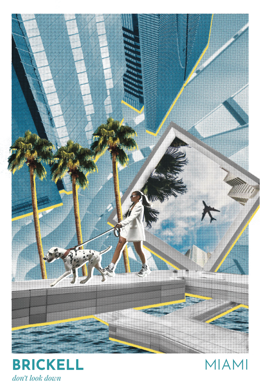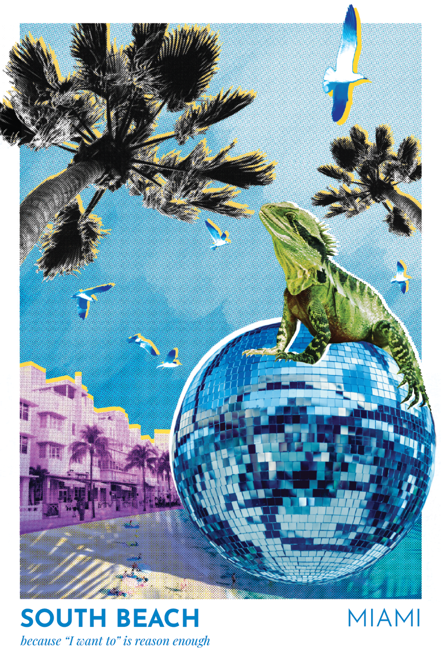 Lorena shared her own moodboards, which helped ensure my interpretations of her chosen Miami neighborhoods are accurate and in line with her vision. I’ve visited Miami a number of times so I was familiar with the areas and their distinct characteristics. I used Procreate on iPad to combine my own photographs with found images. I love collaging and creating surrealist compositions, with clashing perspectives and proportions. I played with colors and textures in order to add dynamism and emphasize the energy of the specific neighborhood.
