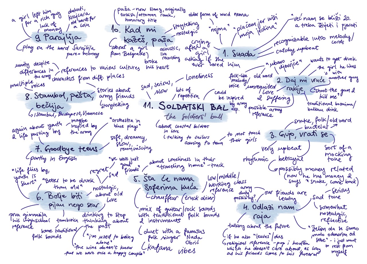 I thought a collage would be a good fit for this album because I could create a scene that reflects the times in which the album was made and encapsulate the Yugoslav culture and humor. Through research and my mom’s advice, I slowly gathered elements to use in the scene that embodied camp, but were still accurate for the 80s.