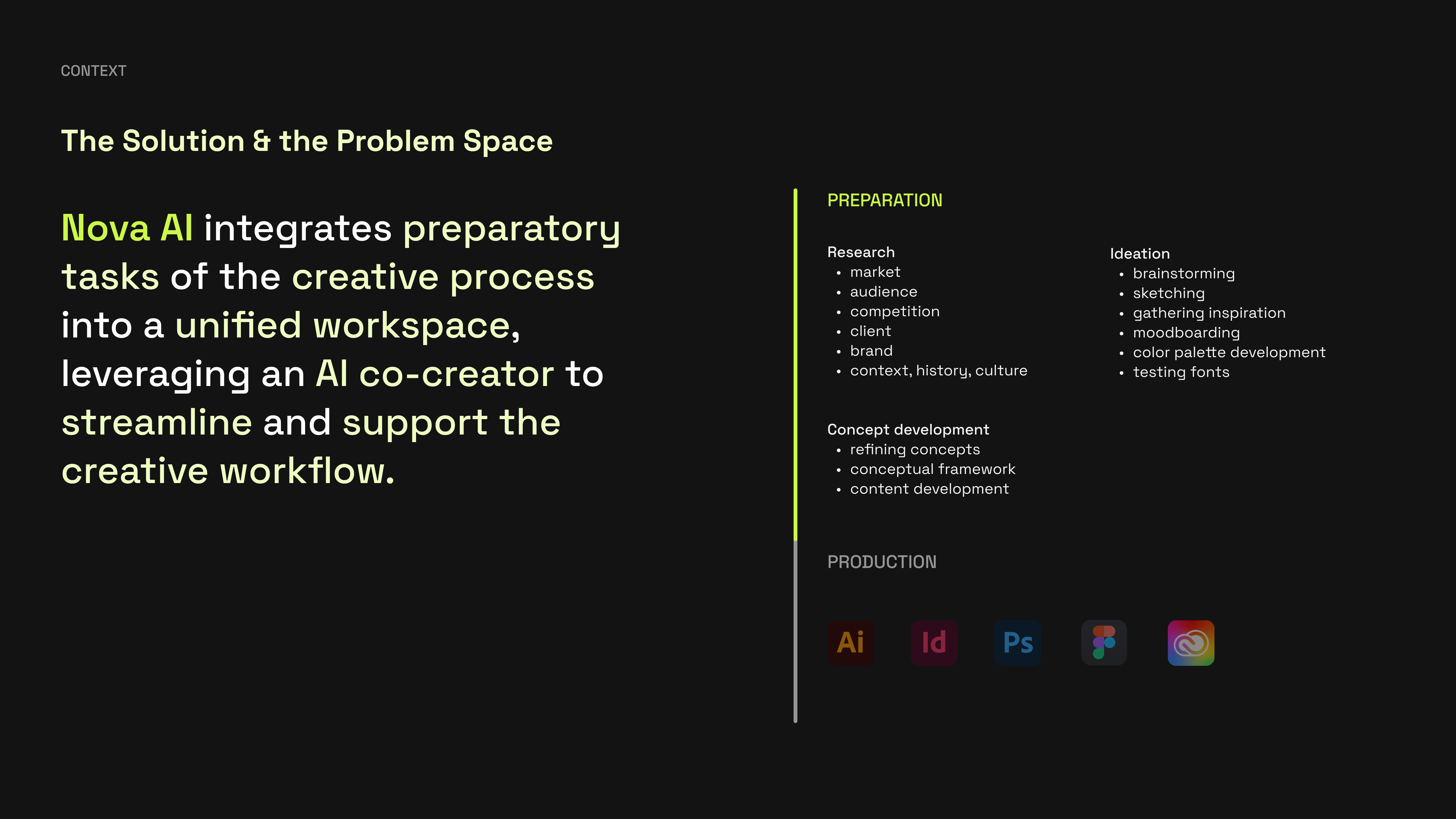 An adaptable platform that centralizes the necessary tools and uses an AI co-creator to accommodate the fluid nature of the creative process. With customizable workspaces, Nova AI can conform to various needs and streamline the creative workflow.Problem Statement