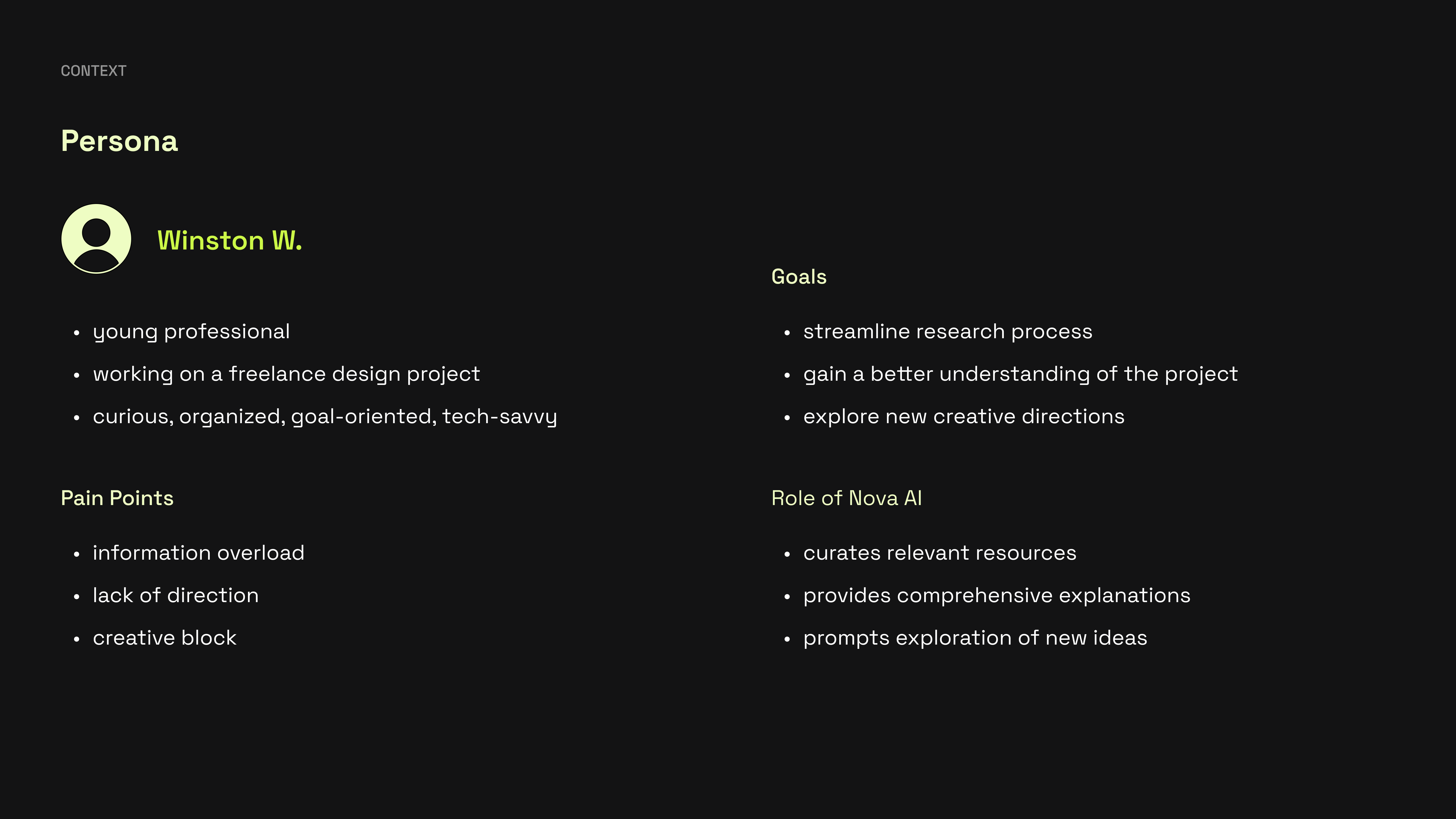 Winston W. is a persona created to illustrate the capabilities of Nova AI in a comprehensive way - by following his creative workflow.User Journey Map