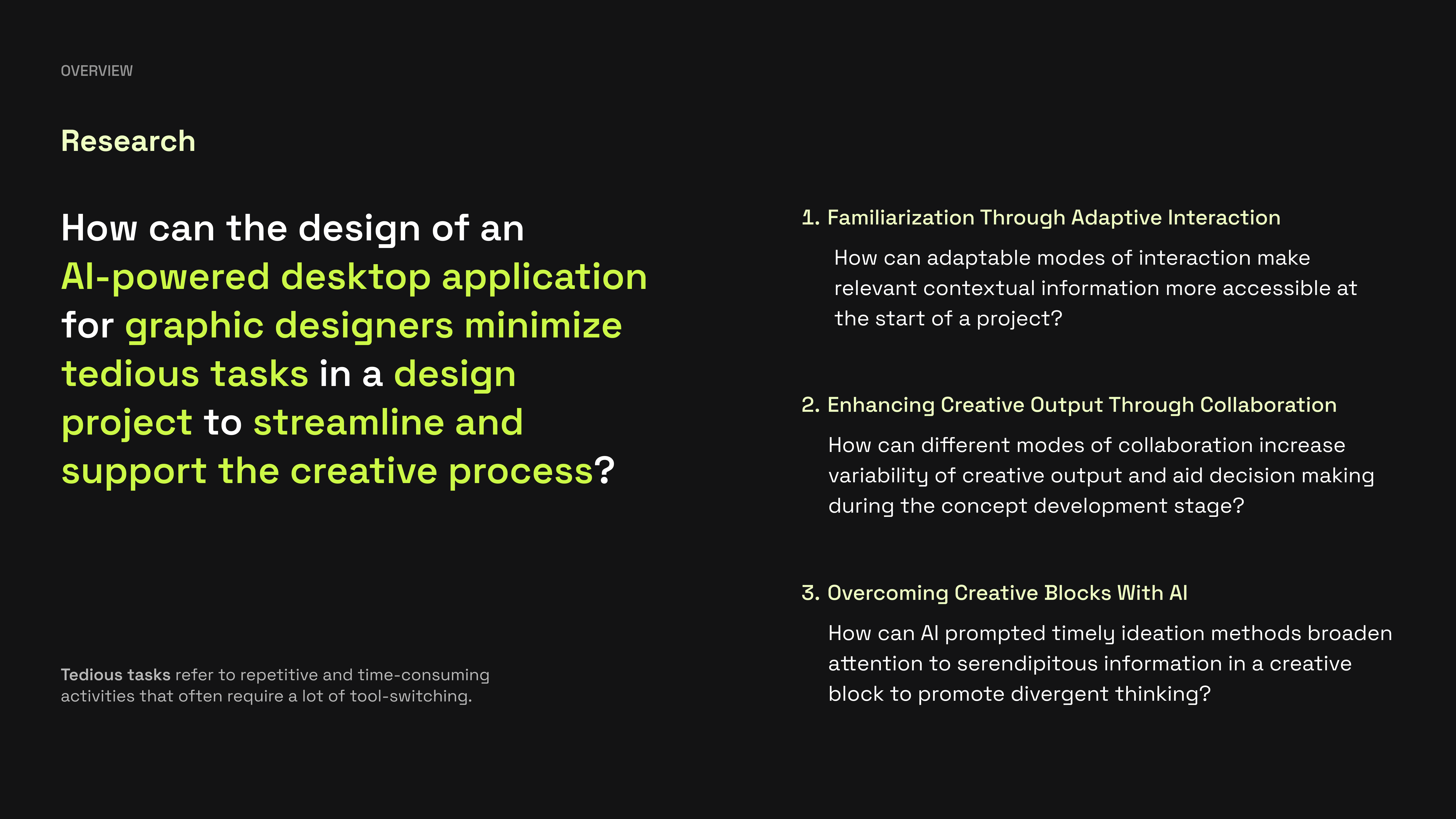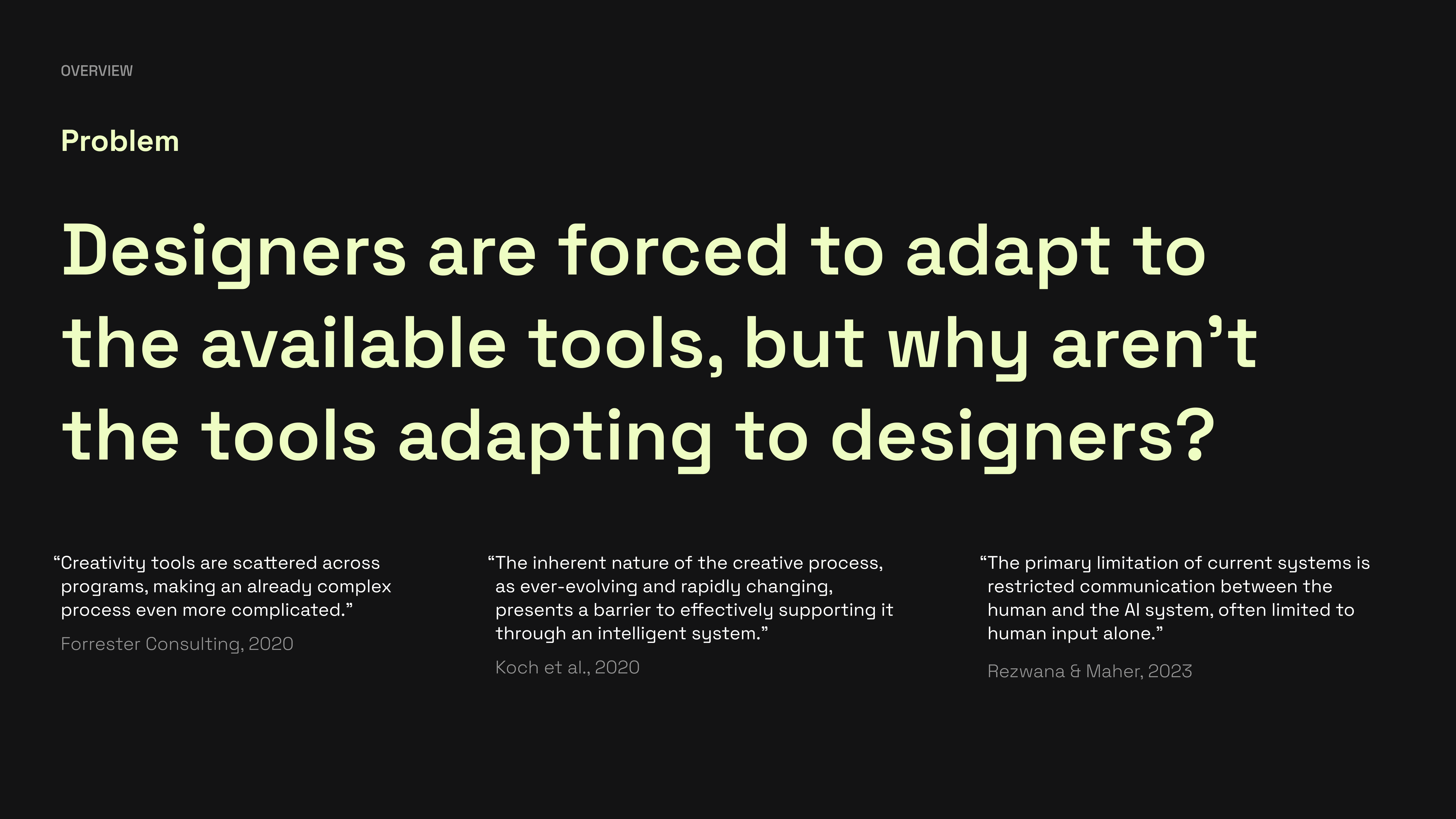 Inspired by existing struggles designers face in their creative process and many unsophisticated AI integrations in existing creative software, I decided to investigate why design tools aren’t considering needs of their primary user base - designers.