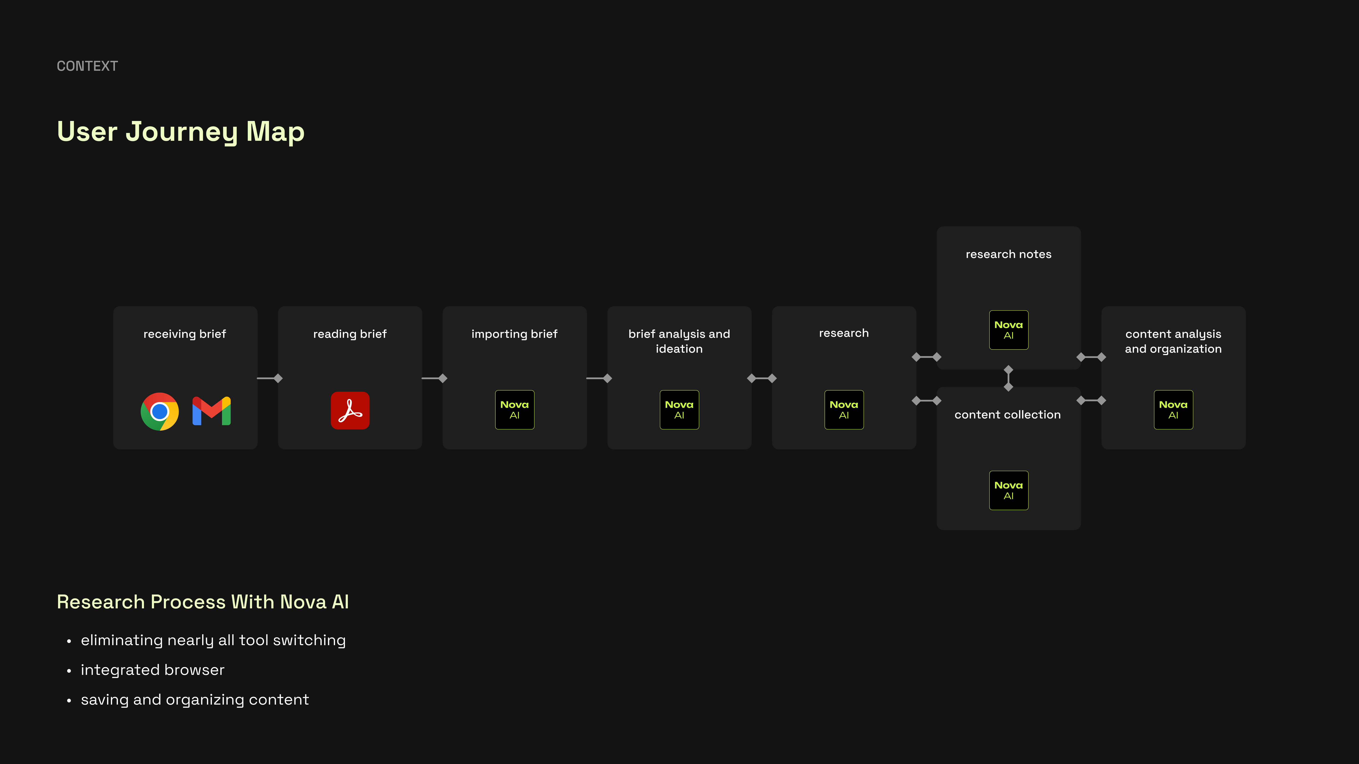 The research process suffers from lots of tool fragmentation due to software limitations. Nova AI eliminates nearly all tool switching due to its integrated browser and ability to save and organize content.