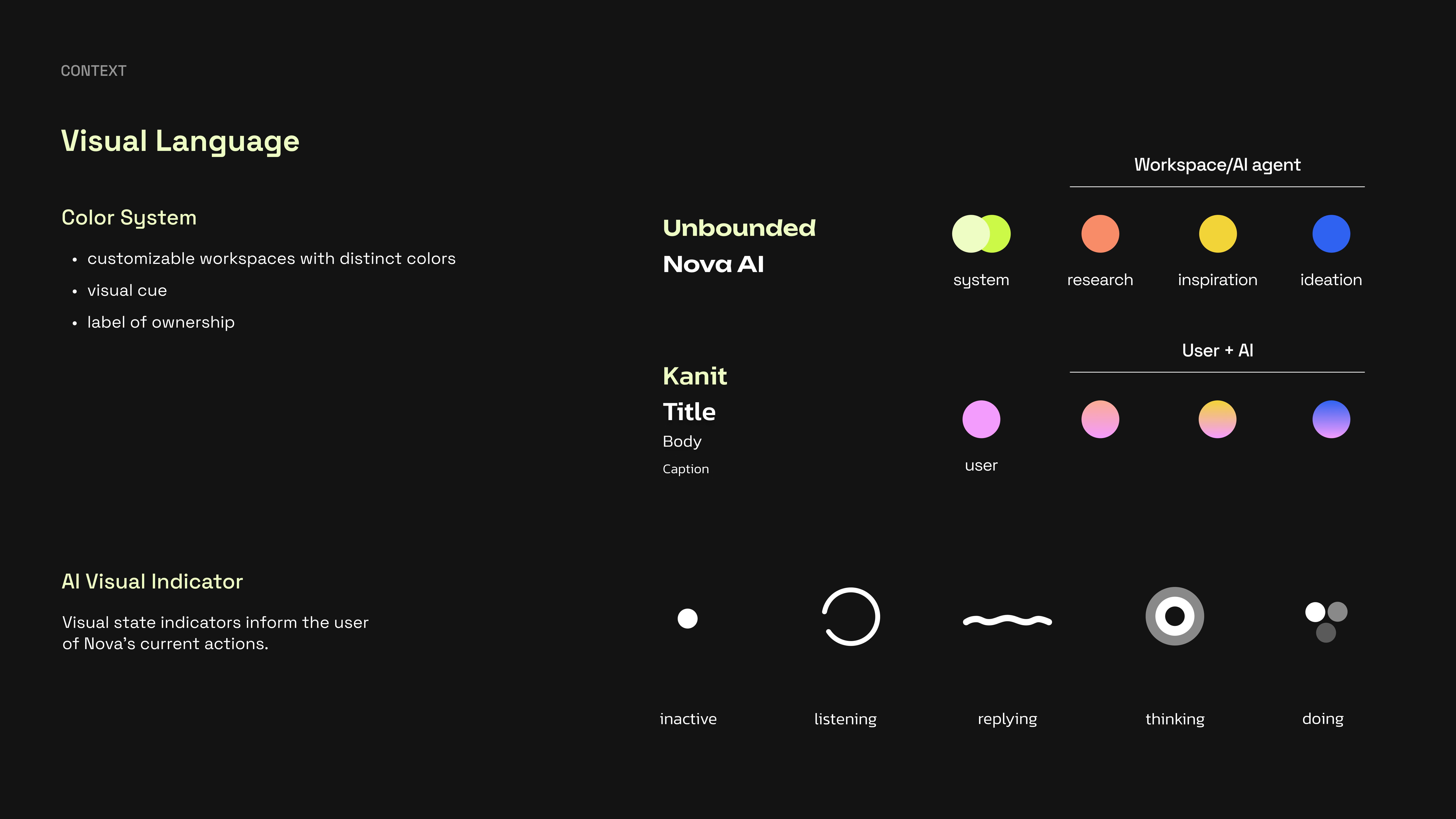 Nova’s workspaces come with customizable colors serving as a distinguishing element between workspaces, as well as a label of ownership in places where the user and AI collaborate.Visual indicators communicate Nova’s current action with the user.