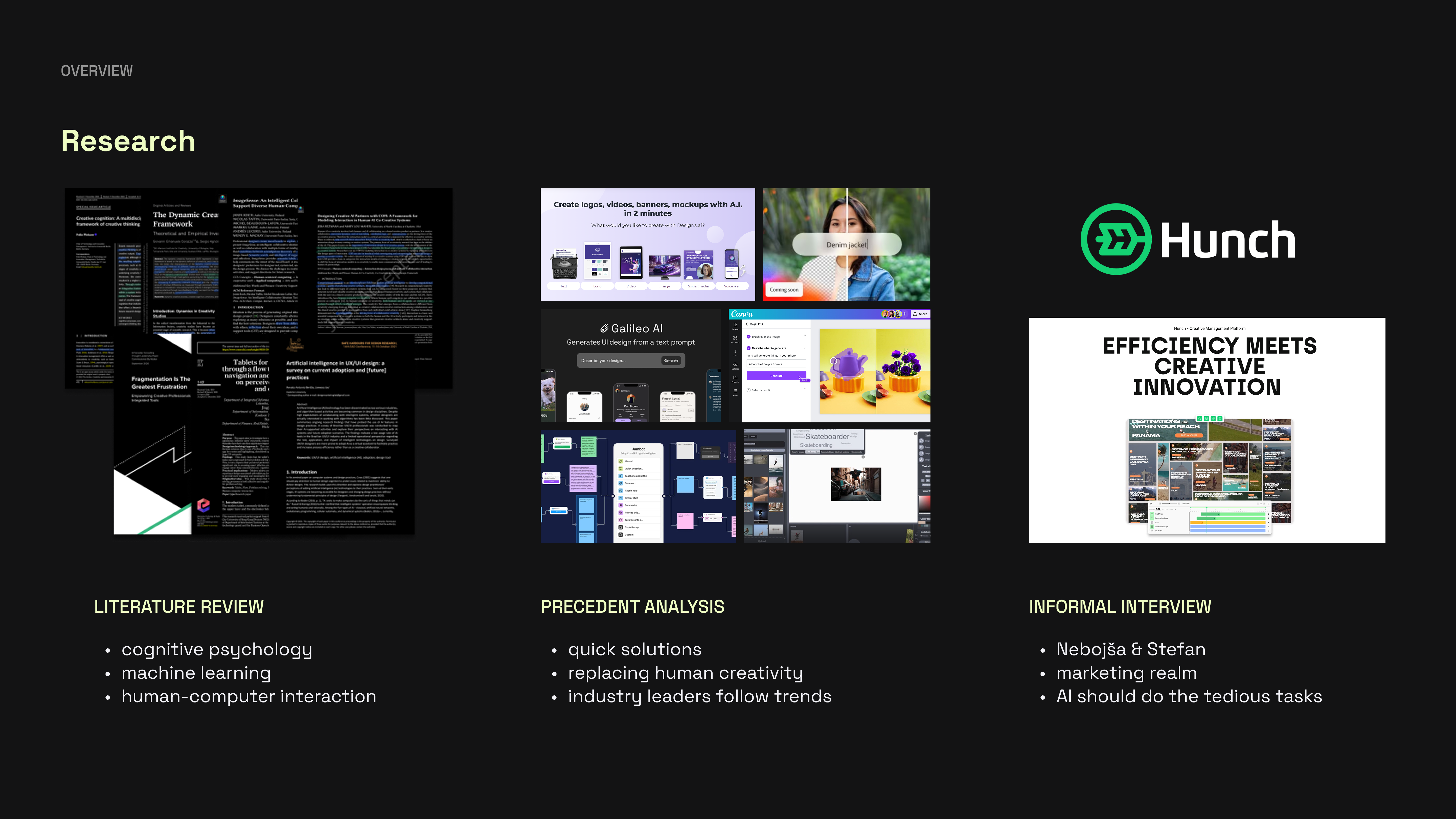 I reviewed literature in cognitive psychology, machine learning, and human-computer interaction, with the goal of creating a good knowledge base in related fields. Precedent analysis revealed that most AI implementations among industry leaders follow trends and are replacing human creativity, instead of supporting it. These notions were supported by interviews with product designers at Hunch, concluding that AI should do the tedious tasks and leave creating to creatives.Research Question & Studies